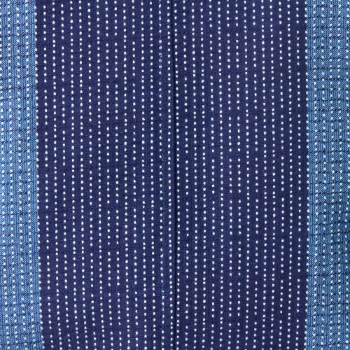 「かつお刺し子」とは、「かつお縞」と呼ばれる織りに刺し子を施したもの。遠州織りの一つ。「かつお縞」とは、濃い藍色から白色まで、ぼかしをつけてあらわされた縞文様のこと。魚の鰹の体の色は背から腹にかけ、だんだんと薄くなっていく。生地の縞柄がその鰹の体の模様を思わせることから「かつお縞」と名付けられました。縞文様は現在では見かける機会が多い文様ですが、古来の日本ではたいへん珍しい文様でした。江戸時代の中ごろ、粋でいなせな「江戸っ子」という概念が広められた当時、単純で明快な縞の柄は粋な文様として大流行し、さまざまな縞柄が誕生したそうです。かつお縞はその中で、考案された文様の1つです。